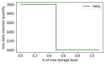 An inventory ratchet means different maximum daily injection or withdrawal quantity depending on the amount of gas in storage. The picture below shows injection ratchets as a function of storage level.